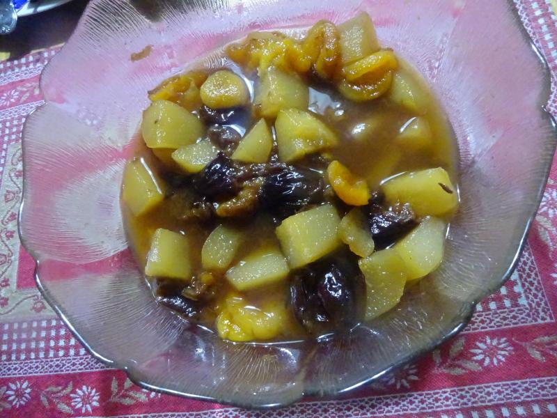 Compota de peras de invierno con orejones (albaricoques secos) y ciruelas claudias tambien levemente pasificadas, para beber Amstel con limón (Radler).