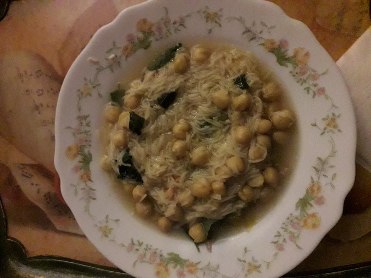 Sopa de "puchero": Apio, puerro, zanahorias (todo en trozos grandes) y muslo de pollo rehogados en AOVE, se cubre bien con agua. Estando en "su punto", se cuela el caldo al cual se le agrega fideos y garbanzos (previamente cocidos) y se cuecen con un poco de hierbabuena.(según gusto puede ser semiduro, al dente o babosos, que hay gustos para todo)