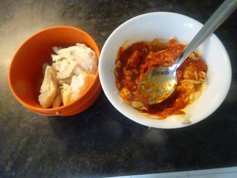 Para comer hoy manduca de recuperación, empanadillas de urta que me sobró del otro dia con huevo duro picado y embalsamadas con tomate frito casero y posterior horneo de tres (3) minutos a 180ºC para que queden doraditas.