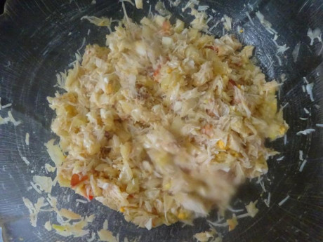 Las pinzas de la masera una vez cocidas se van rompiendo con la ayuda de un martillo de teflón sobre una tabla de idem, se reserva la carne y se tiran las cáscaras, luego se procede a mezclar la carne con los ingredientes de la manera ya descrita.