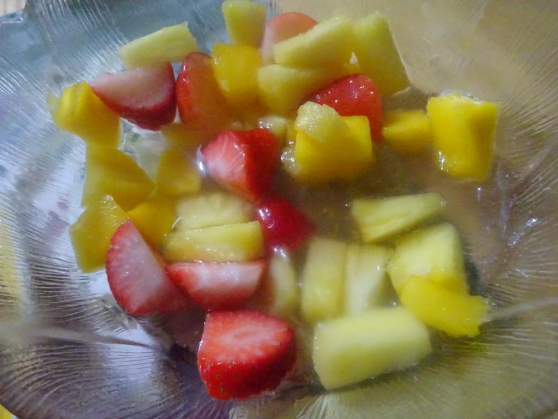 Cena ligerita para entonar el estomago, purrusalda y macedonia de frutas frescas, para beber más Mahou.