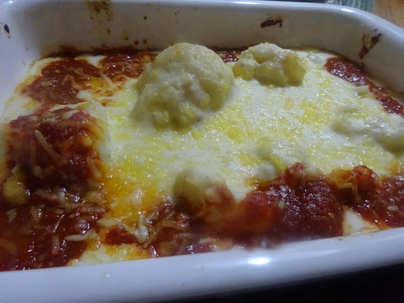 Coliflor con bechamel y tomate gratinada con queso Emmental rallado, la coliflor le cuece en agua con leche y no mucho para que no quede blanducha, se sacan las flores de la coliflor y se colocan en una fuente de horno, se napan con la bechamel y se añade un ondaquino de tomate frito, fuerte nevada de queso rallado y al horno hasta que se funda el queso.
