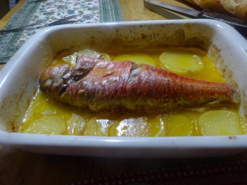 Acelgas hervidas con refrito de AOVEX y ajos de las Pedroñeras, salmonete de 650 gramos al horno con mejunje de AOVEX, Fino Coquinero y zumo de limon verde para naparlo en frío, diez (10) minutos de horno precalentado a 180 Cº y listo para jamar, de postre pera Williams y de bebercio Mateus Rosé.