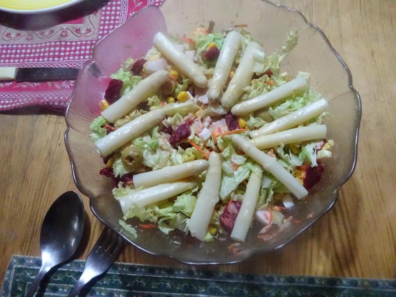 Ensalada mixta de lechuga, ventresca de bonito, patata cocida, aceitunas, maiz dulce, remolacha y unas yemas de espàrragos del Junca.-Navarra, para el aliño AOVEX Arbequina, zumo de limón y sal marina.