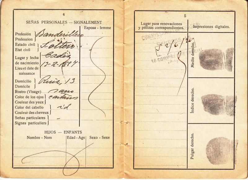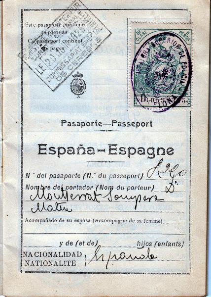 Pasaporte expedido en 1925 en Barcelona a Monserrat Sampere Mateu , Catedrática de Música y Canto del Conservatorio del Liceo de Barcelona.