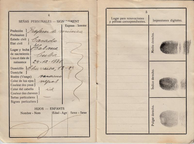 Pasaporte expedido en 1924 al Profesor de Música, nacido en la Cuba Española en 1886,