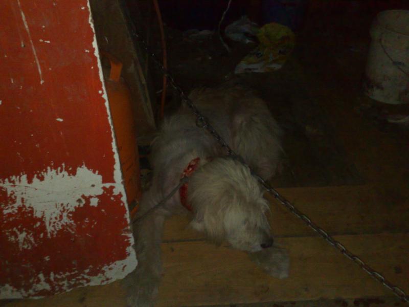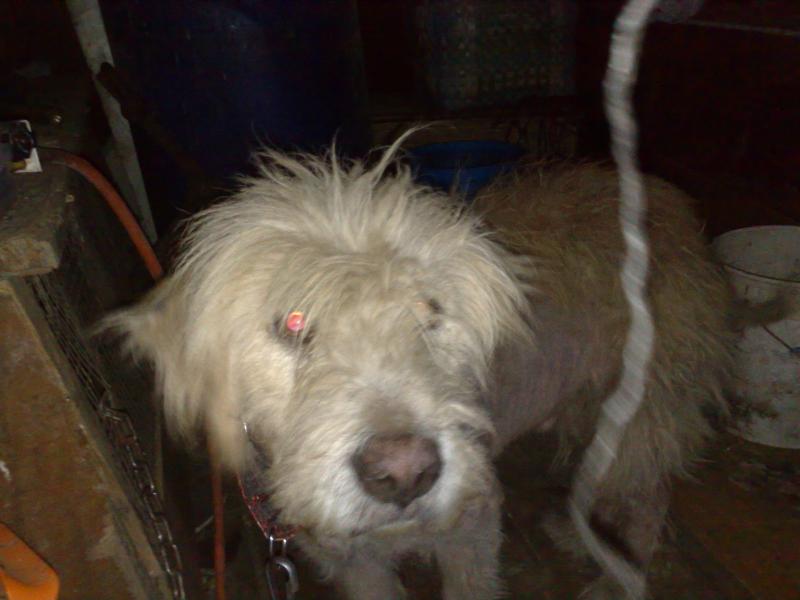 Éste es el caso mas reciente que hemos atendido,ayer nos hicimos cargo del perro,su dueño como el perrito tiene 12 años ya no tiene derecho ni siquiera a pagarle un tratamiento de la alergia que tiene a las pulgas,alergia que le ha producido en la piel una infección descomunal,agravada con heridas infectadas que el mismo perro se ha hecho de rascarse sin parar, todo el día atado a una cuerda durmiendo entre sus propias heces,ratas y demás fauna portadora de enfermedades y su dueño hablando con él nos dijo que: a mi ese perro ya no me vale es demasiado viejo, o os lo llevais o lo mato,en fin,ver para creer que existan mentalidades así.