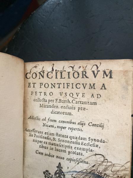 Un libro de Bartolomé de Carranza de 1584, arzobispo de Toledo y acusado de hereje y juzgado y condenado por la inquisición.