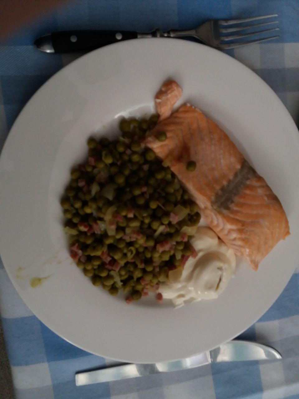 Uboat escribió:Salmón al vapor con guisantes y jamón.