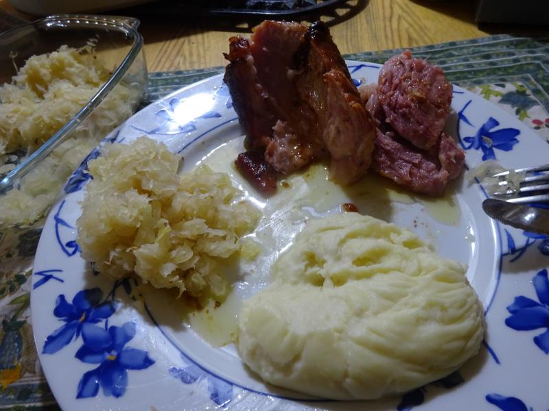 Codillo de cerdo asado con puré de patata y chukrut, para beber Viña Alberdi de La Rioja Alta.