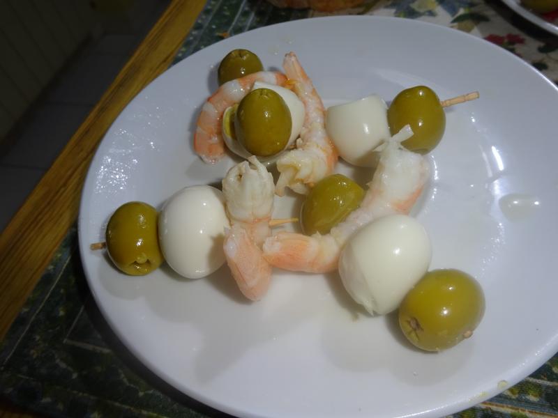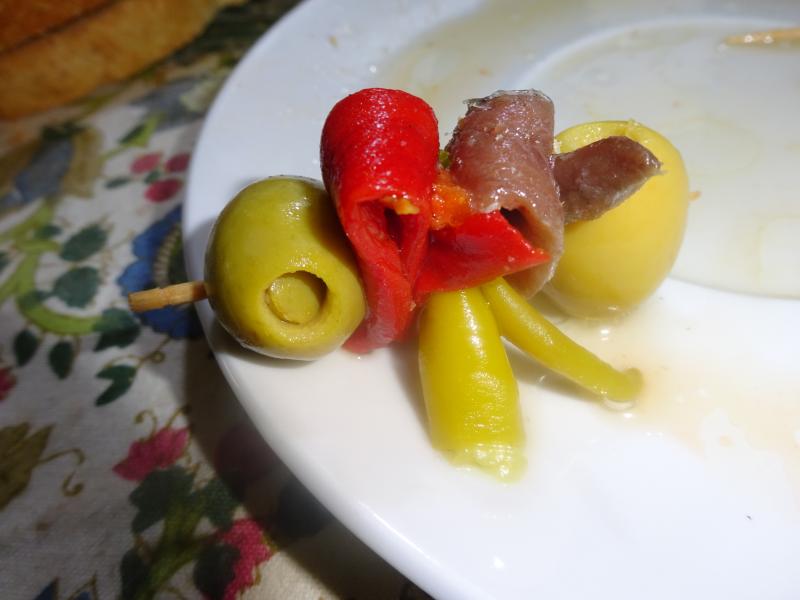 Aperitivos variados, Gilda picante y bilbainitos, de comida seria un par de huevos fritos en AOVEX Picual con acompañamiento choricil.