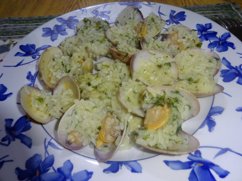 Se sofríe un poco de ajo en AOVEX Picual hasta que comienza a dorarse, en ese momento echas las almejas gordas y en cuanto se abran añades una taza de arroz y tres de agua, salpimentas, revuelves y tapas hasta que hierva todo el conjunto durante veinte (20) minutos, apagas el fuego y deja reposar 5 minutos, listo para comer.