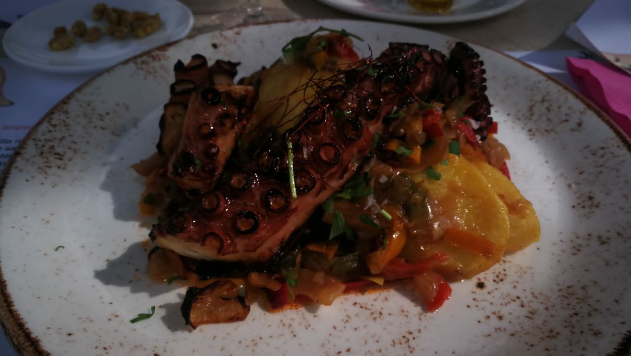 Pata de pulpo a la brasa con patatas cocidas y verduras.