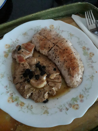 Hemos degustado un solomillo de pavo o pava a la plancha y con guarnición de un hermoso gurumelo también a la plancha
