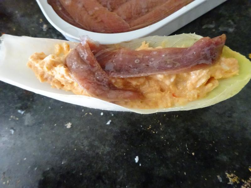 Como aperitivo me he puesto unas endivias con bonito del norte desmigado bien mezclado con mayonesa, tomate frito y huevo duro trefilado con remate final de filete de anchoa del Consorcio, me he comido solo tres (3) antes de las alubiorras.