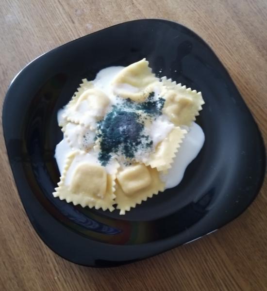 Raviolis rellenos de queso con salsa de Kéfir y Camembert y un poquito de Spirulina. Hay que tener cuidado con las algas que contienen mucho yodo.