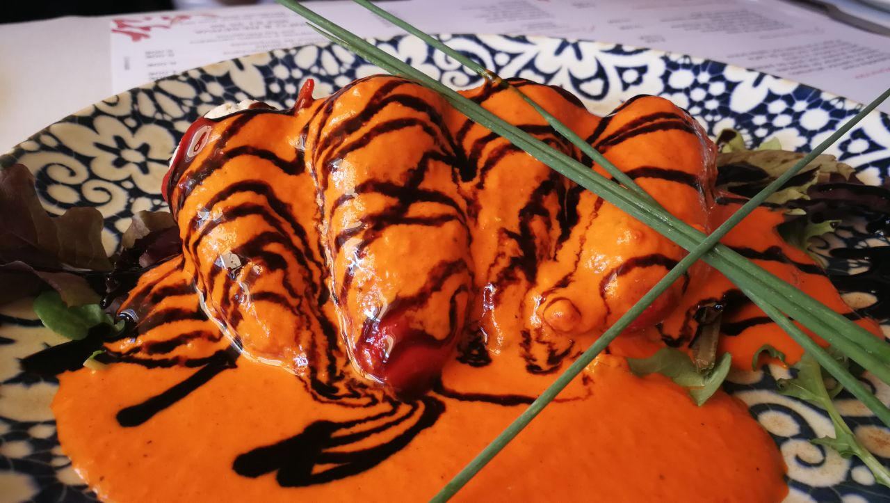 Pimientos del Piquillo rellenos de mousse de atún y con salsa de ellos mismos.