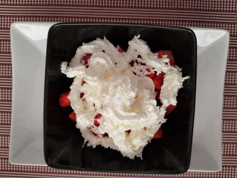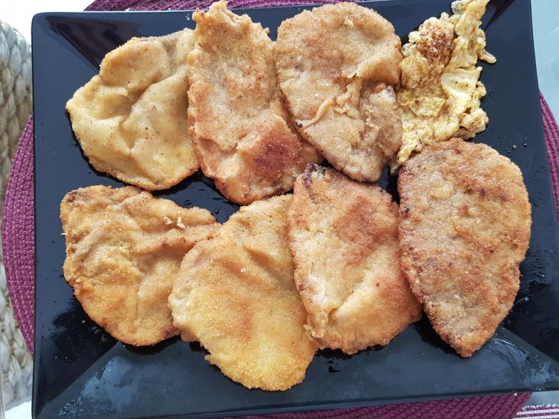 Hoy para comer filetes vacuno empanados en harina huevo y pan rallado. De postre fresas con nata de spray y de beber agua del grifo, alguien tiene que beber la y me toca a mi.