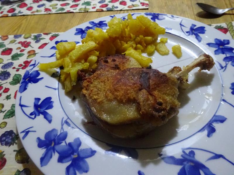 La otra pata de pato que venía en la lata con papas fritas en su grasa y de postre macedonia de frutas del tiempo con chorrito de Cointreau, para beber Protos Roble, me ha sobrado para cenar o para mañana.