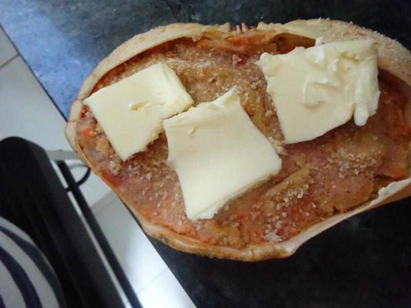 Cuando está frío y con paciencia franciscana voy retirando la poca carne que tiene y la voy reservando, luego añado huevo cocido reducido a casi polvo, cucharadita de tomate frito, nuez moscada rallada en el momento, pimienta negra recien molida, un ondaquino de brandy quemado y poquito de nata liquida, se mueve todo con garbo en un bol y se rellena la cascara del animalito, lluvia de pan rallado, pellas de mantequilla y al horno a 180ºC hasta que se dore.
