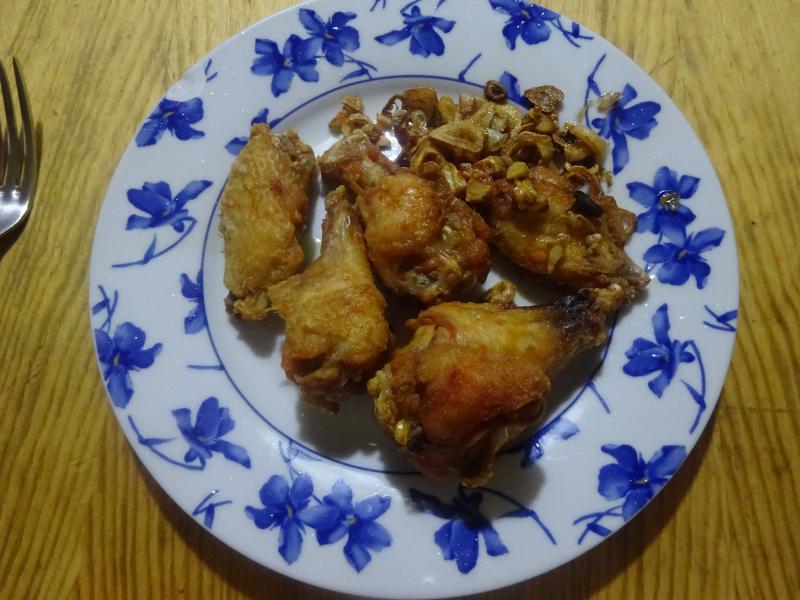 Pechuga de pollo no cobarde (este era mu tirao pálante), a la nata con mostaza, con cebollita picada y champiñones.