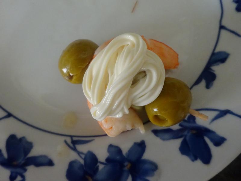 Pincho nuevo, aceituna rellena de anchoa, alcachofa mini, gamba y remate con otra aceituna rellena, luego pella de mayonesa y listo para comer.