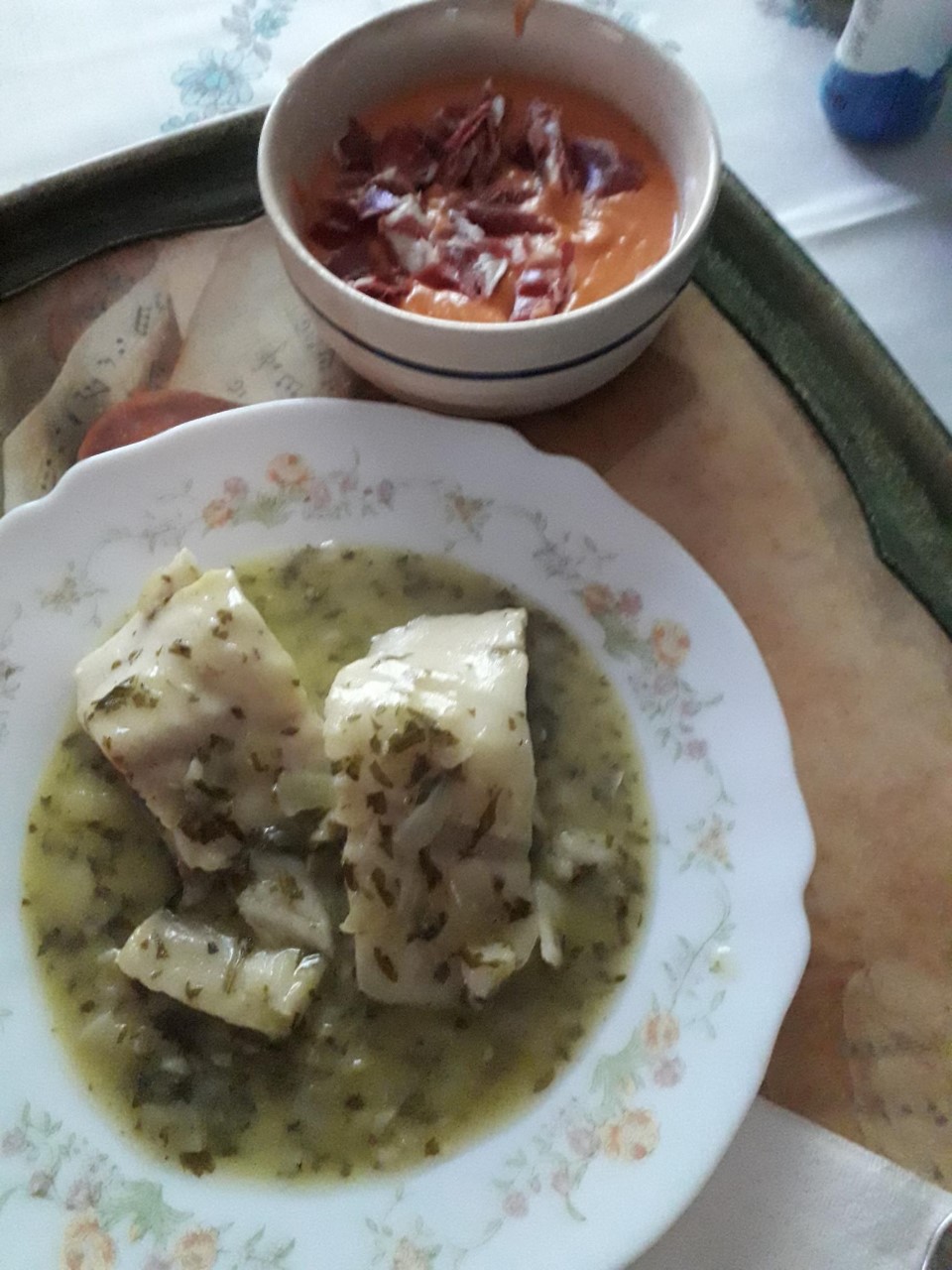 Merluza en salsa verde y salmorejo.