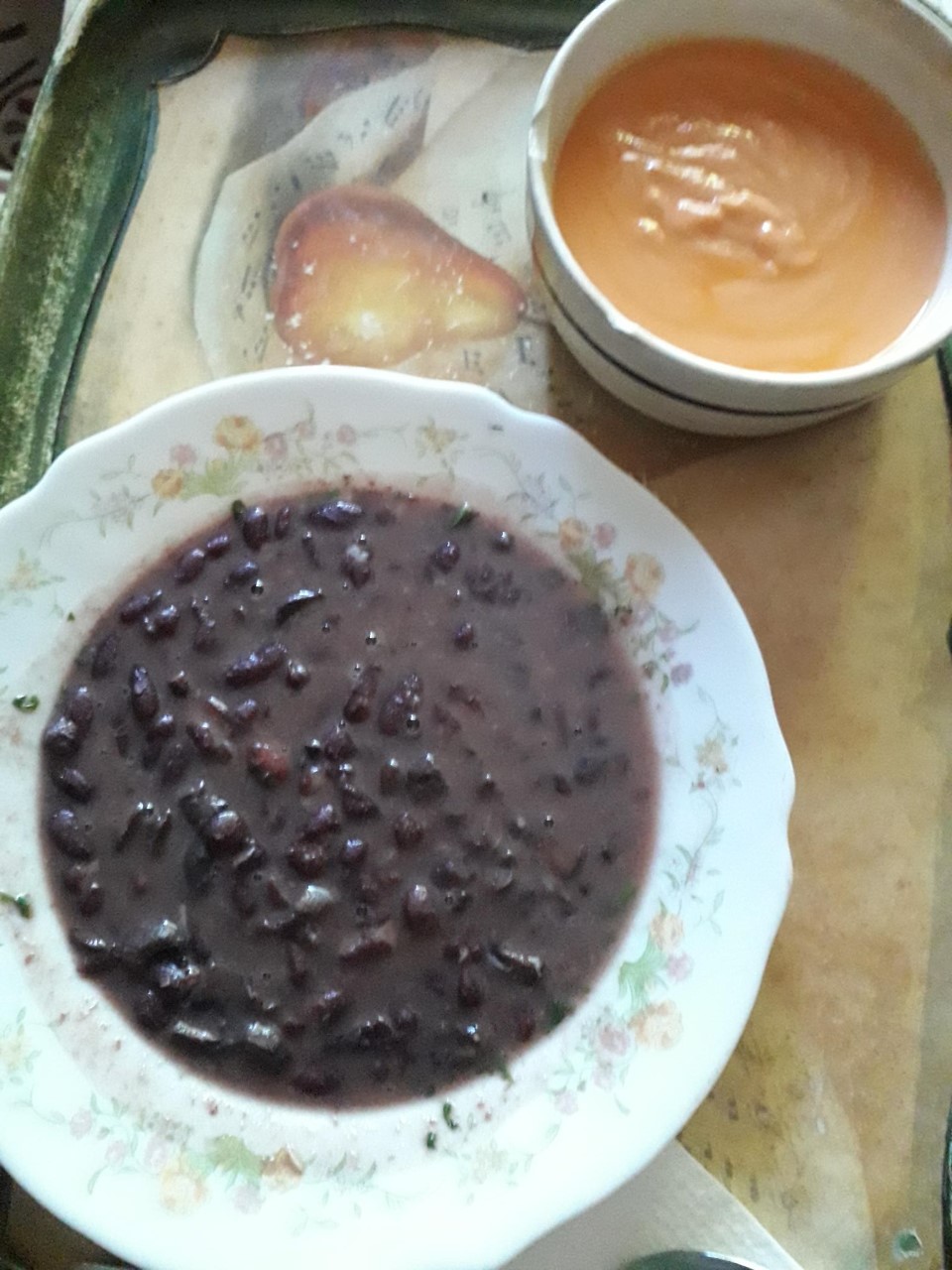 Yo si que tengo hoy H. C. para dar y regalar, y es que aunque haga mucha calor la cuchara se mueve de vez en cuando: Chicharos pintos con champis Portobello acompañados de un salmorejo para compensar el calor- frío.