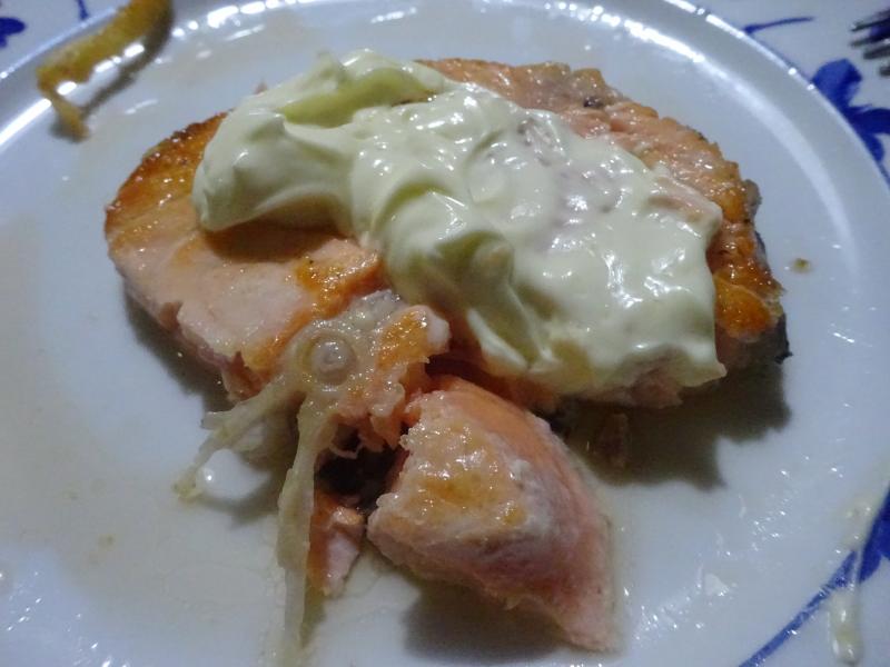 Ensaladilla nacional para comer y para cenar rodajita a la plancha de salmón piscifactorado con una pella de mayonesa de casa.