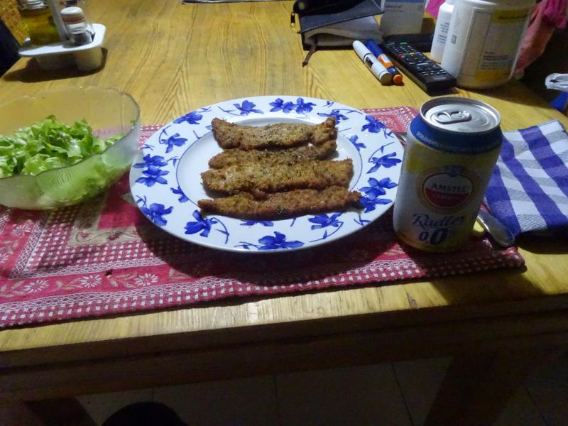 Para cenar unos filetes de pata de cerdo iberico a la provenzal, se pasan por huevo, pan rallado con ajo y perejil y se doran en AOVEX, lechuga aliñada con vinagre de sidra y Hojiblanca.