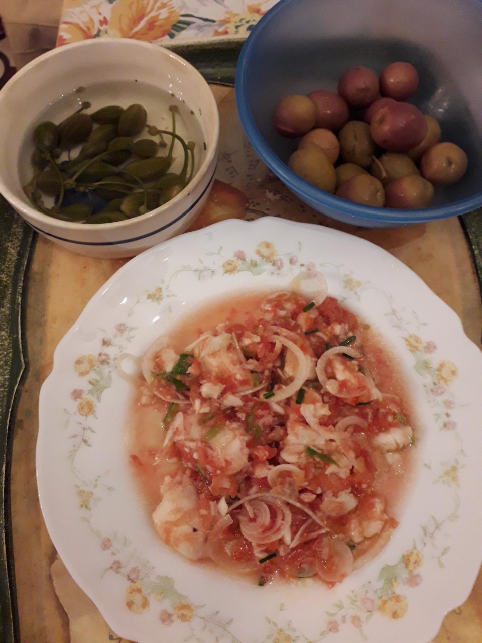 Merluza en salsa alegre, aceitunas gordales machacás y aliñás, y alcaparrones (sin premio :) en aliño.
