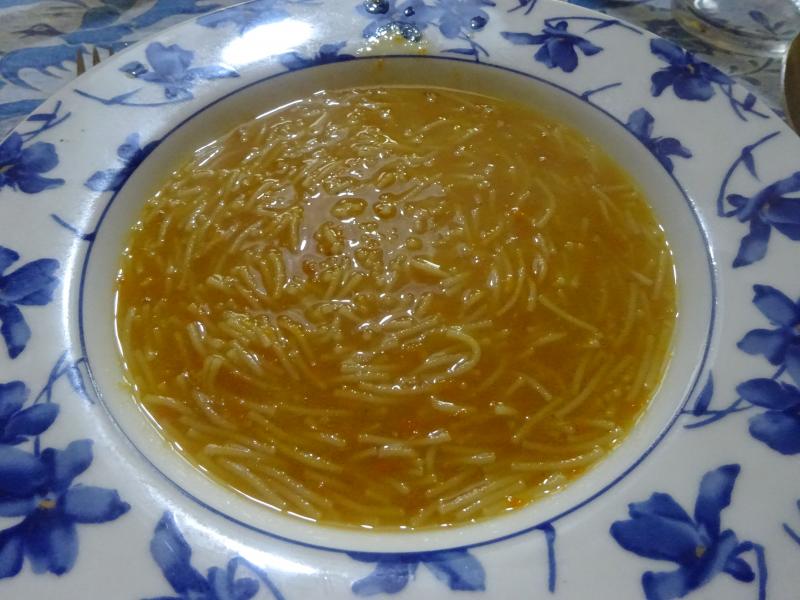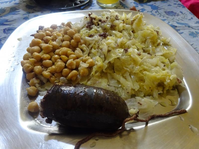 Sopa de caldo de gallina con fideos finos "capellinni", col hervida sin sal con garbanzos lechosos y morcilla de Burgos, de postre fresón de Palos y para beber sidra guipuzcoana.