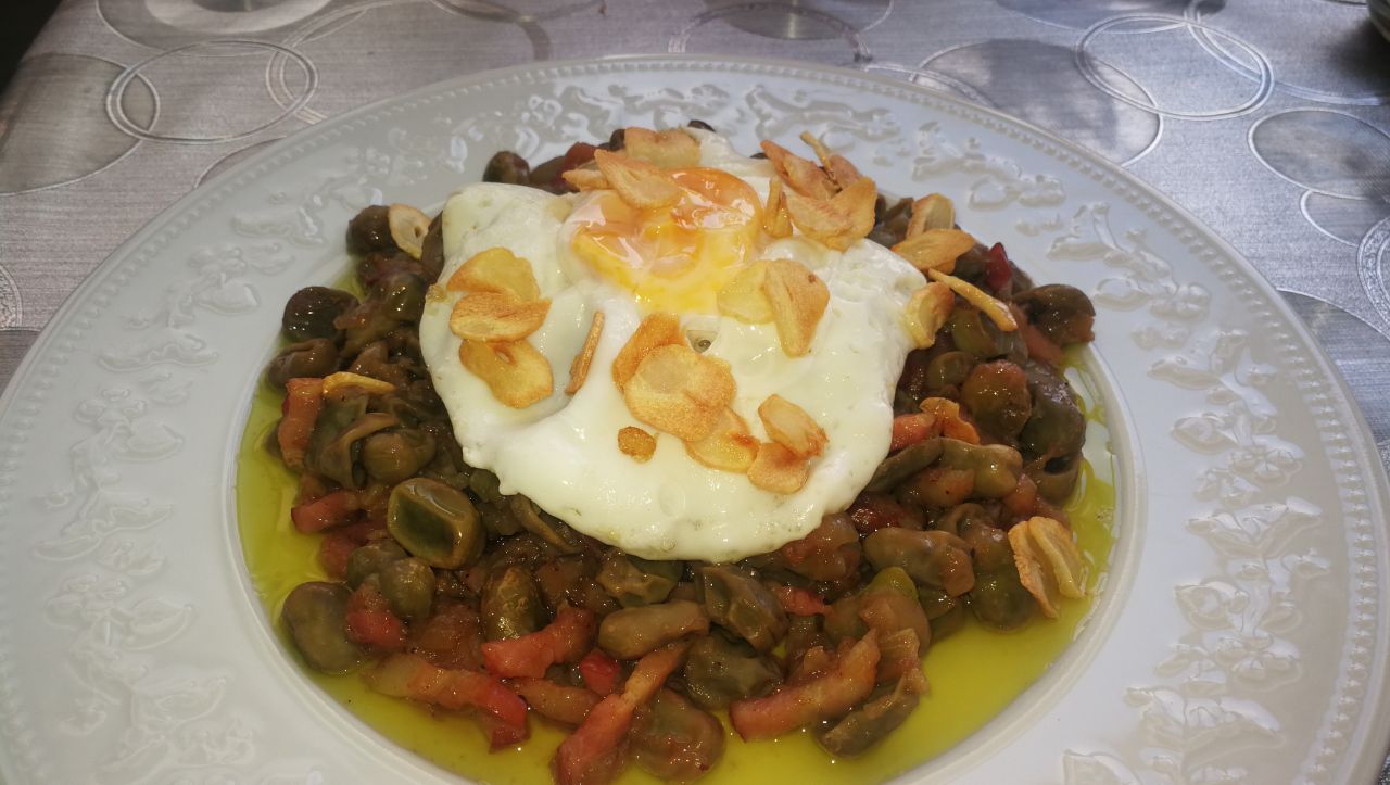 Habas con jamón y, de sombrero, un huevo frito con su ajito.