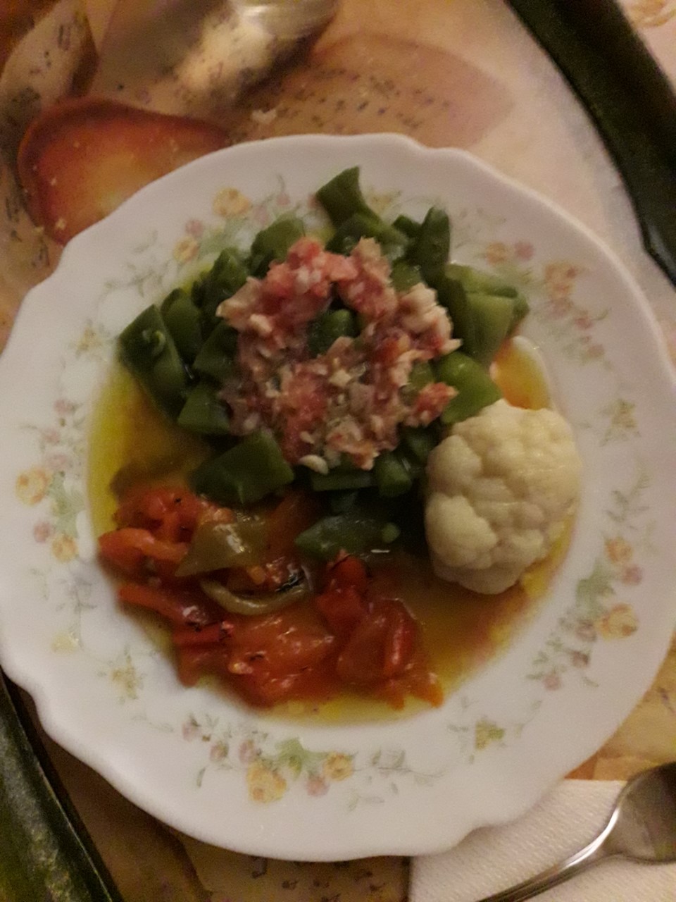 Un poquito "de todo": Judias verdes, pimientos asados, coliflor, pescada en salsa alegre. Y me fuí a la cama muy contento :)