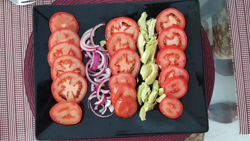 Ensalada tomates pera cebolla y aguacates.