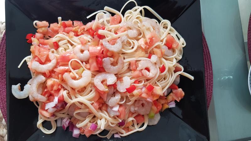 Speguetis cocidos en ensalada con tomate, un poco de pimiento y gambas congeladas, esto todo crudo.