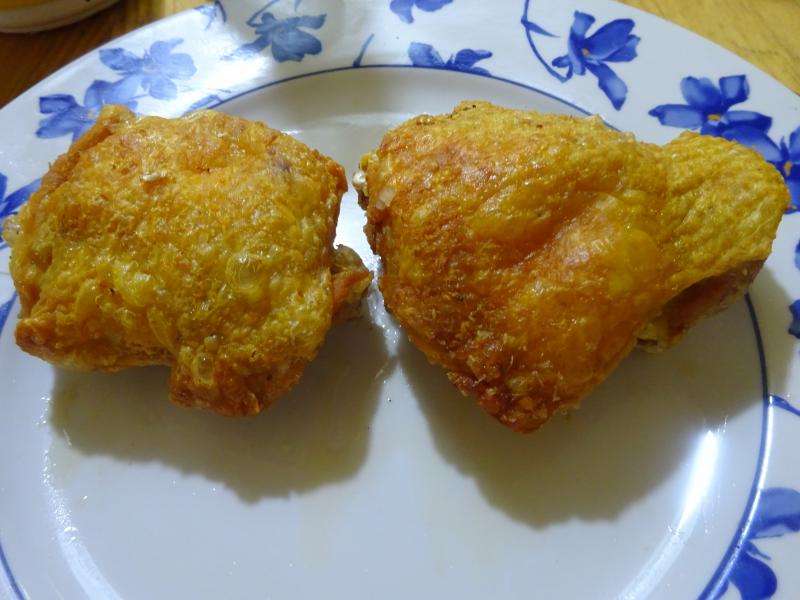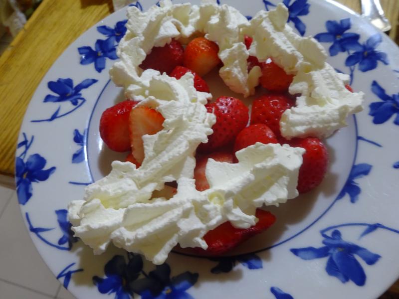 Espaguettis integrales "al burro" de primer plato, contramuslos de pollo fritos en Arbequina de segundo plato y fresas con nata de bote de postre.