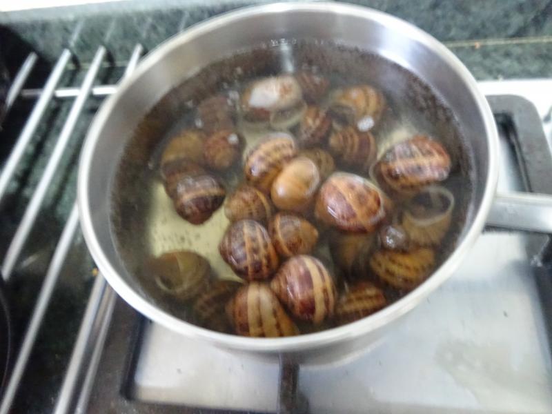 Los caracoles se cuecen vivos partiendo de agua fría, a medida que se va calentando el agua asoman el pedúnculo (pie) y para cuando se quieren dar cuenta ya están cocidos, si se echan en agua hirviendo se engarran y no hay dios que luego los saque de la cascara, se cuela el agua y se reservan los caracoles hasta que tengas la vizcaina hecha, cuando eso ocurre se añaden los caracoles y se les da un pequeño hervor, añadir algo de picante aumenta su suculencia, se dejan reposar media hora y ¡al buche!, un vasito de tinto español marida y acompaña perfectamente.
