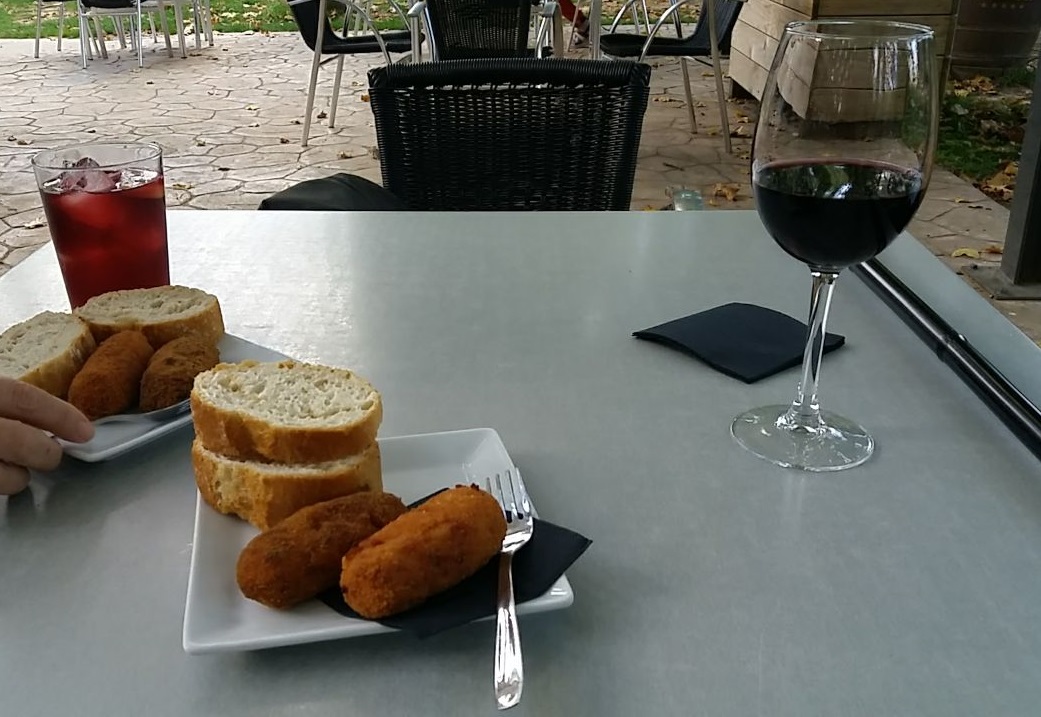 Unas croquetas de picadillo, y otras del puchero, junto al famoso Ribera de Duero tomado junto al Duero.
