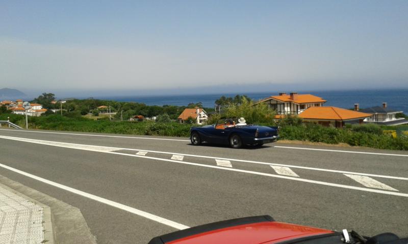 Los ha visto Einar repostando en Arenillas, media vuelta y a por ellos, salen de la gasolinera y se paran a consultar el Mapamundi de Cantabria, les abordo para preguntar con cortesía versallesca por el buga: Daimler SP250 de 1960, conservado en perfecto estado, no restaurado, algo increíble para un españolito de a pie, aqui se tiraría a la chatarra como coche viejo y plan PIVE o te fríen a impuestos, señores de clase media con muy buen pinta, de español ni papa claro, envidia muy cochina que me han dado, naturalmente les he deseado buen viaje y tirando para casa les he recomendado comer en el mejor restaurante de Castro: El Puerto de Santa María, sí, el de la rabas de esta mañana, las mejores de Europa.