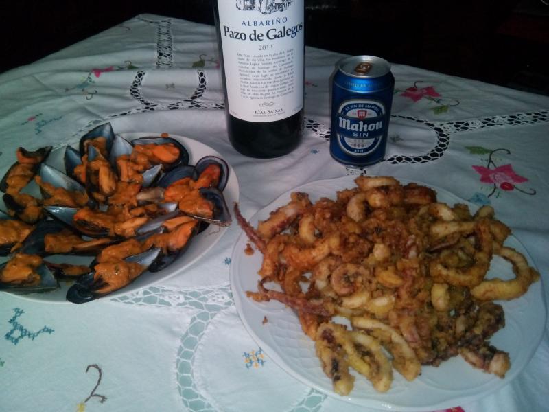 No son de magano, pero no son mancas las rabas de pota, para mi mas sabrosas !! Los mejillones y su salsa completan el almuerzo.