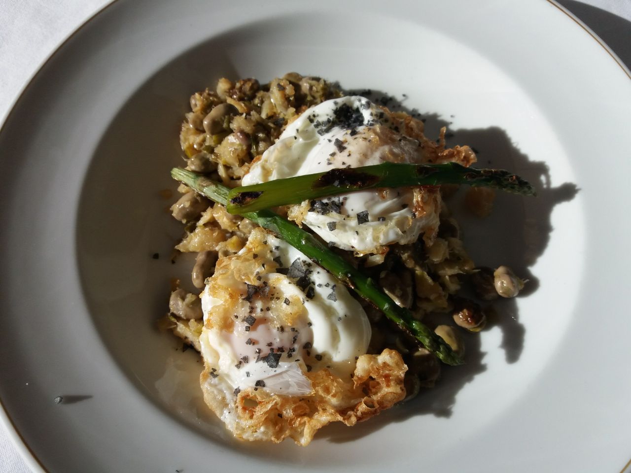 Huevos rotos con espárragos sobre cama de habitas tiernas.