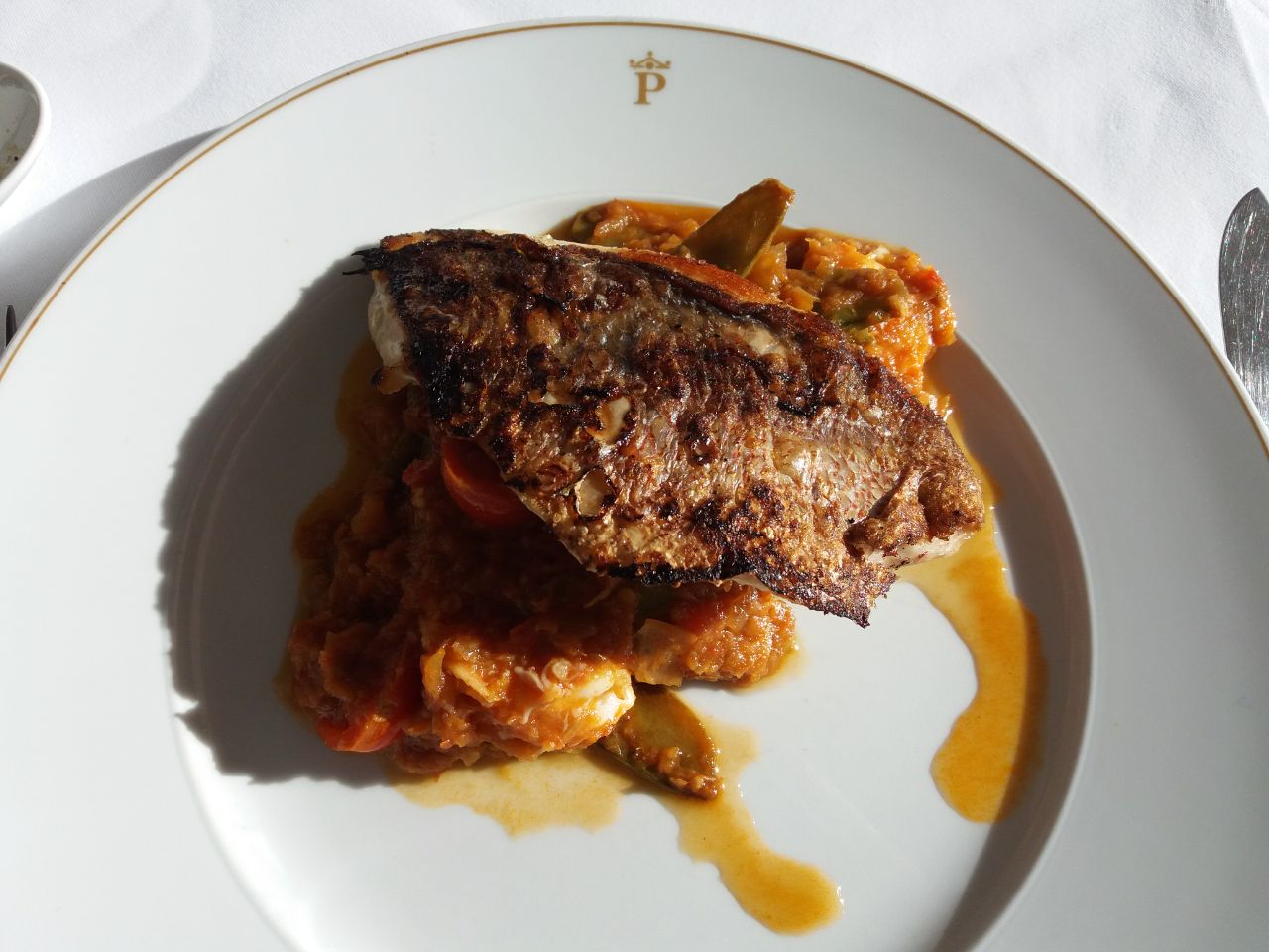 Perca sobre guiso de verduras.