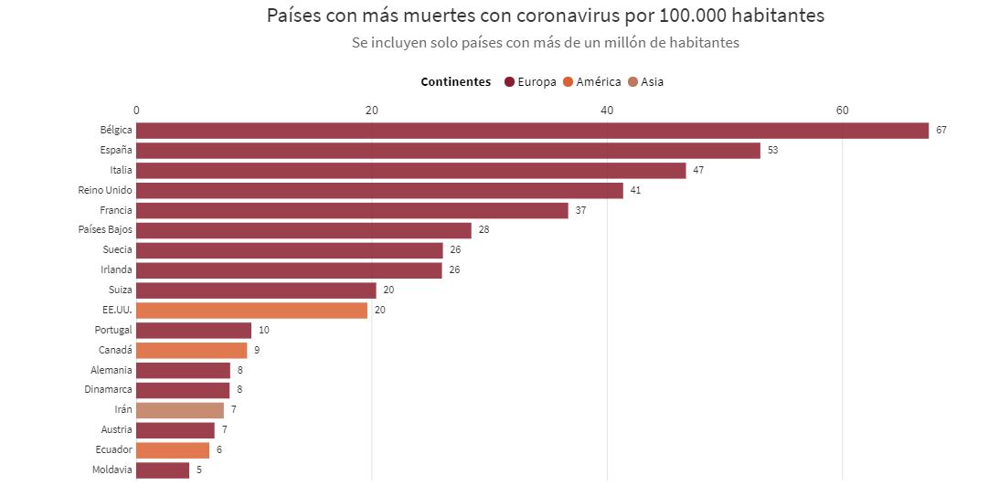Según algunas fuentes el país con más muertos por cada 100000 habitantes es Bélgica, luego España.