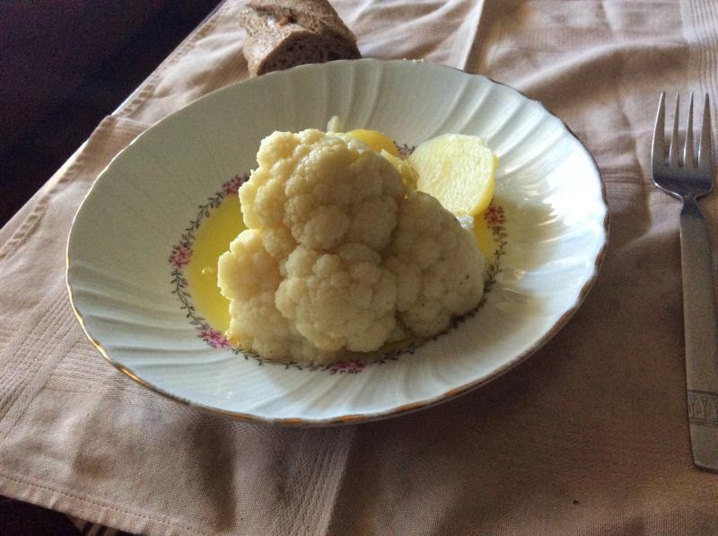 Hoy para comer nada de particular, coliflor al vapor con refrito de Arbequina con ajos de Las Pedroñeras y manzana reineta de postre, para beber agua.