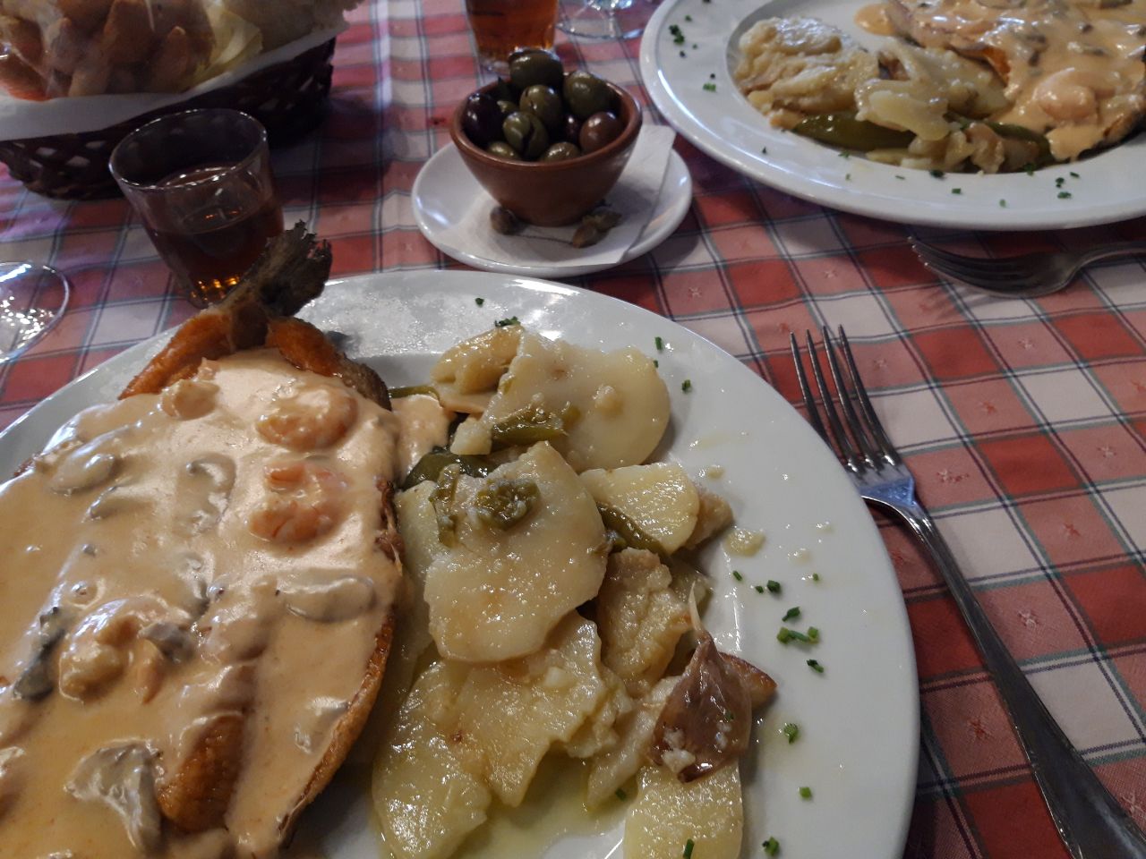 Truchas con champiñones y gambas. De guarnición papas a lo pobre. Hoy estaban excelentes.