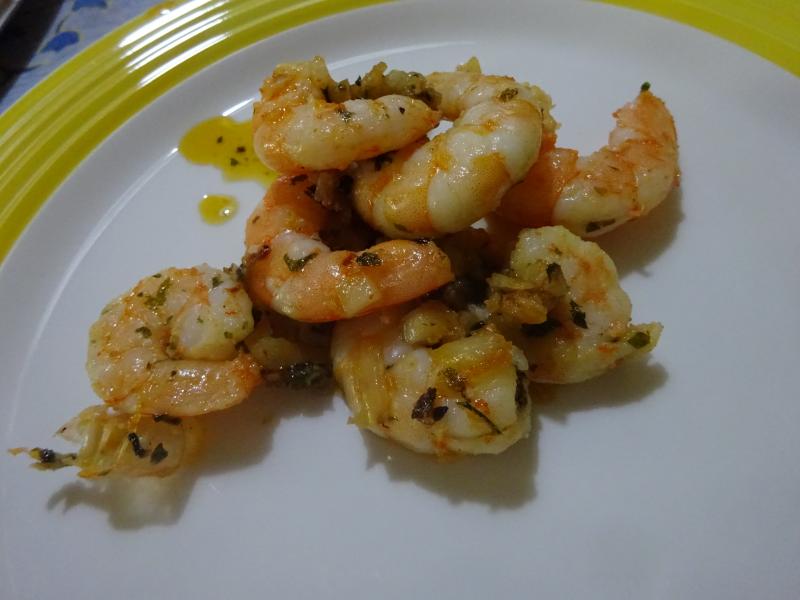 Gambas al ajillo levemente picantonas y macarrones Penne Rigatte al pommodoro.