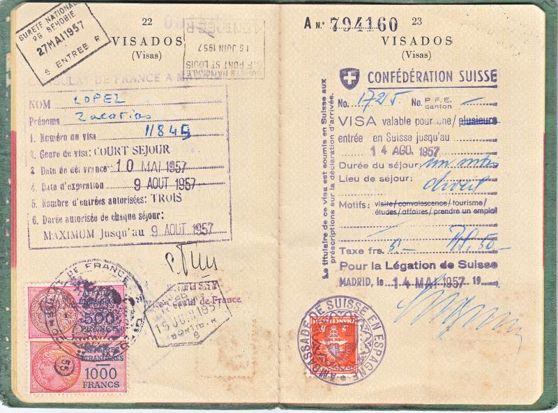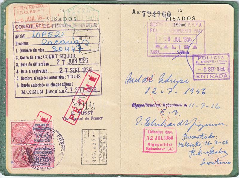 Pasaporte expedido en Madrid en Junio de 1956 al estudiante, Zacarías López Melendo .