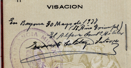 Detalles de visados de una señora con pasaporte chileno que desembarco en Lisboa en plena guerra civil y entra en España por Bayona.