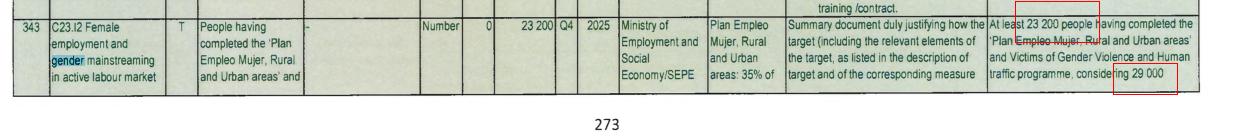 Al menos 23.200 personas que hayan cumplimentado el “plan de empleo mujer zonas rurales y urbanas” y el programa de "víctimas de violencia de género y tráfico de personas" considerando 29.000 personas inscritas. Este programa supone un itinerario personal é integrado de acciones de orientación, asesoramiento y formación ajustado al perfil de empleabilidad de las mujeres participantes.